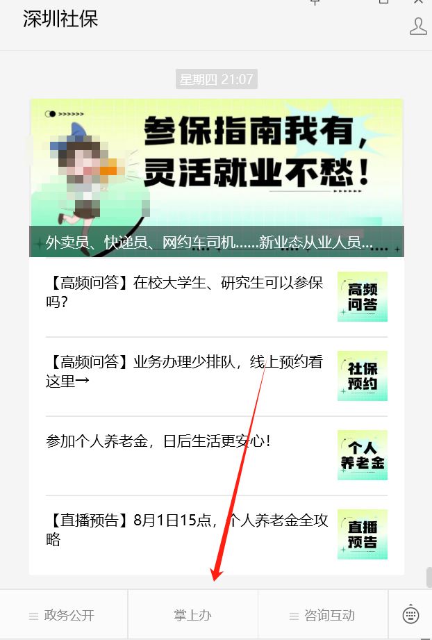 “深圳社保”公众号——菜单栏“掌上办”——“业务办理”——“参保管理”——“灵活就业登记和参保登记”