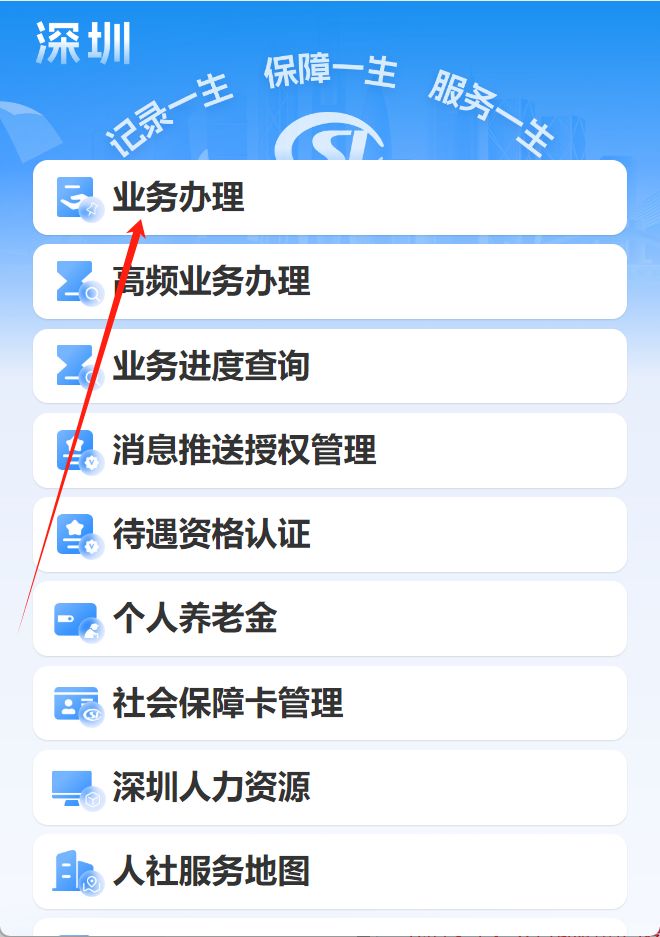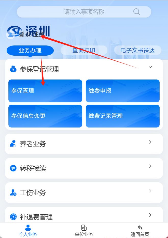1、登录系统:进入“深圳社保”公众号菜单栏 ,点击 “掌上办”-“业务办理”,使用个人账户密码登录、人脸识别登录,或选择省政务服务网认证入口登录。