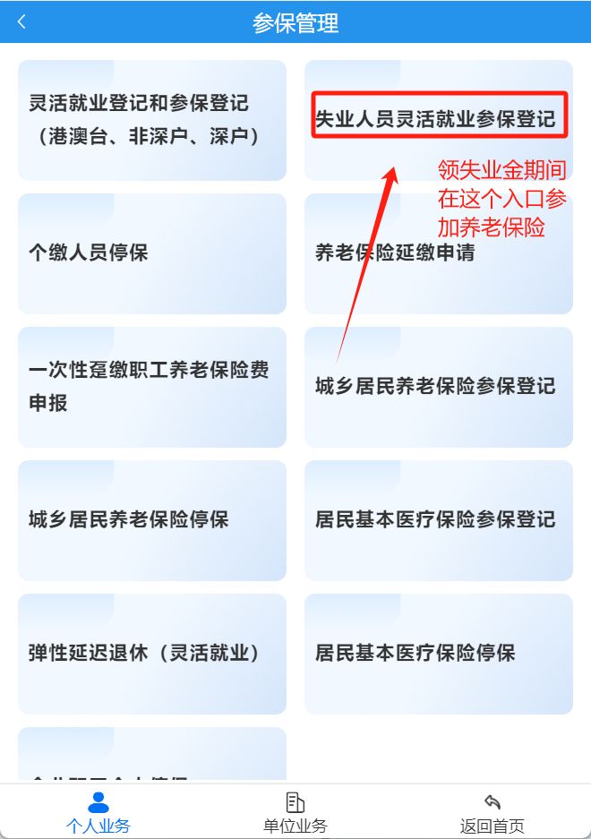 2、选择参保登记:进入系统后,点击 “个人参保管理”,选择 “失业人员灵活就业参保登记”。