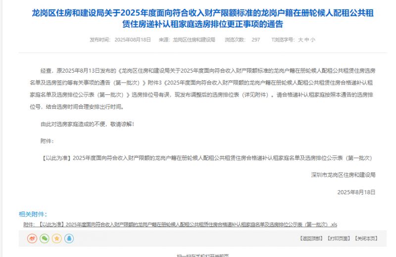 深圳市龙岗区住房和建设局2025年8月18日发布更正通告,请合格递补认租家庭按照8月18日通告的选房排位号,结合选房时间合理安排出行时间。