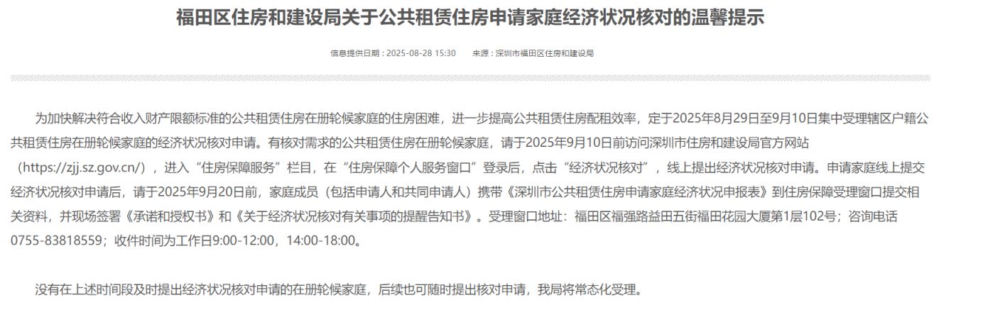 福田区住建局2025年8月29日至9月10日集中受理辖区户籍公租房在册轮候家庭的经济状况核对申请,申请人线上提交申请后带着材料去现场办理,没有在上述时间段及时提出经济状况核对申请的在册轮候家庭,后续也可随时提出核对申请,福田区住建局将常态化受理。