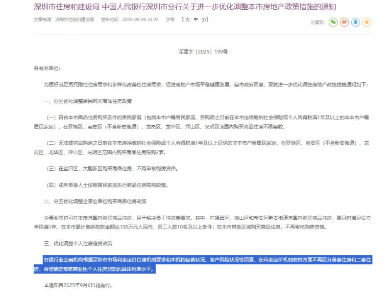 2025年9月5日,深圳市住房和建设局、中国人民银行深圳市分行联合印发《关于进一步优化调整本市房地产政策措施的通知》,自2025年9月6日起施行。