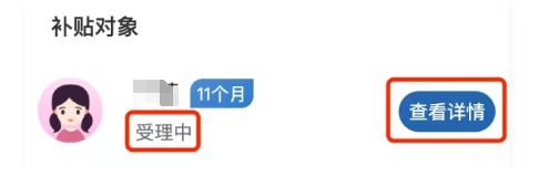 育儿补贴显示“受理中”是正在审核,“待发放”状态是指申请单已经审核通过,右侧按钮为【查看详情】,点击后可以查看申请单详情。