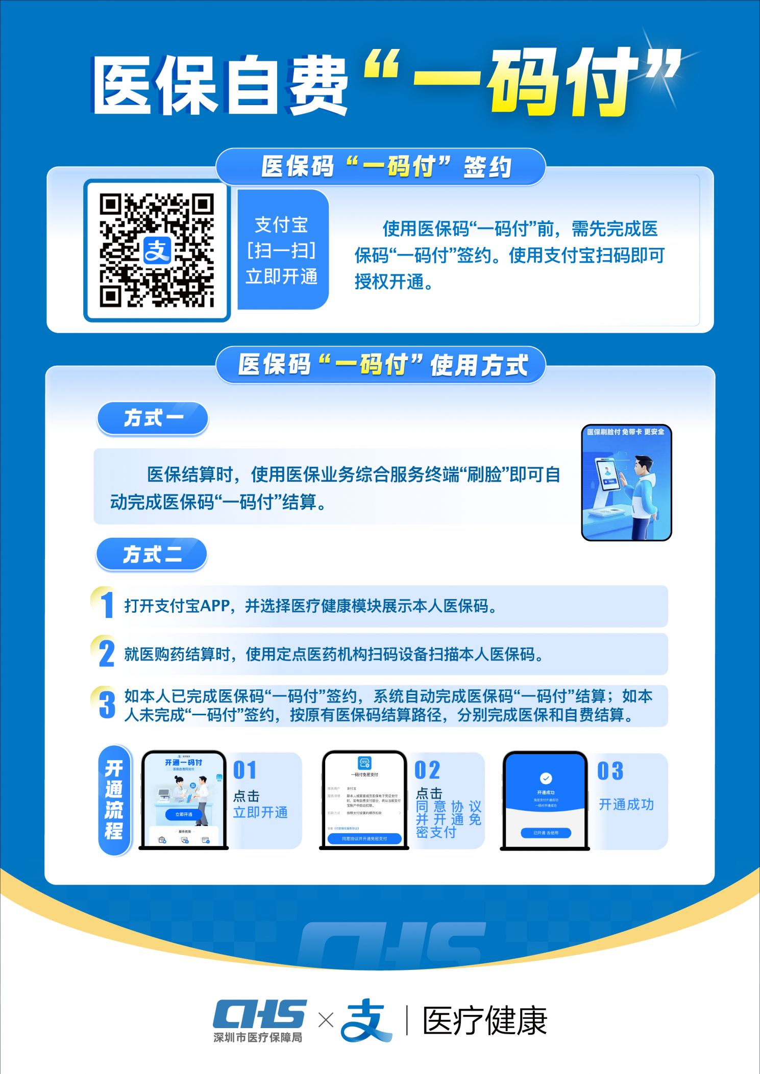 支付宝开通深圳医保“一码付”,参保群众在就医过程中,仅需医保码扫码或刷脸一次,即可完成医保报销及自费支付功能。真正实现“无卡就医、无码支付”的智慧化就医体验。