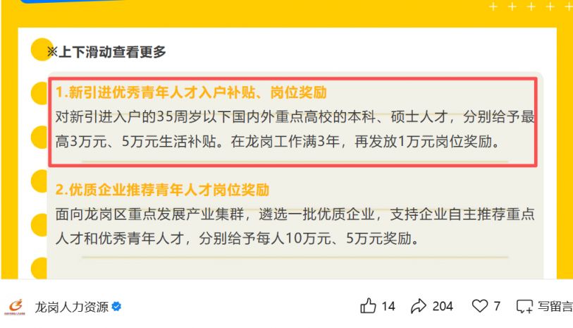 对新引进入户的35周岁以下国内外重点高校的本科、硕士人才,分别给予最高3万元、5万元生活补贴。在龙岗工作满3年,再发放1万元岗位奖励。