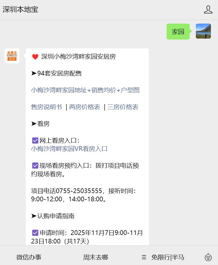 温馨提示:微信搜索公众号【深圳本地宝】,关注后回复【家园】获取小梅沙湾畔家园安居房地址、售价、两房三房价格表、户型图及售房说明书、线上看房入口和现场看房预约电话、认购申请入口及申请指南、预计交付时间等