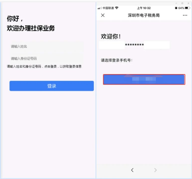 输入姓名和身份证号码,点击【登录】,选择登录手机号。