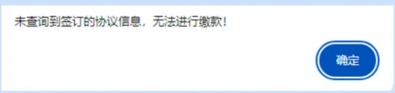 提示:在没有签订协议的情况下,点击【缴费】会提示“未查询到签订的协议信息,无法进行缴款!”需返回【首页点击【协议签订】功能新增扣款协议。