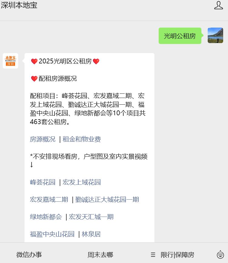 温馨提示:微信搜索公众号【深圳本地宝】,关注后在对话框回复【光明公租房】可获光明区公租房最新房源情况、租金和物业费标准、户型图和室内实景视频、申请时间、申请入口和申请指南等