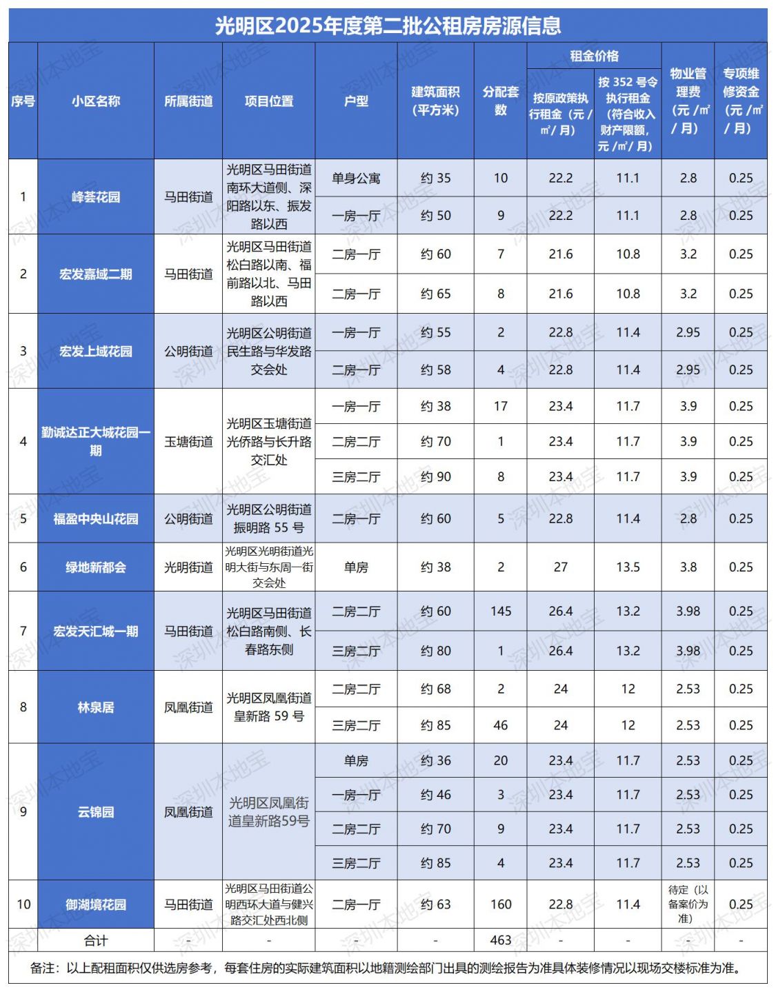 2025年11月25日9:00-12月1日18:00(共7天),光明住建局面向光明区户籍公租房轮候人配租463套公租房,房源地址、租金等见下表