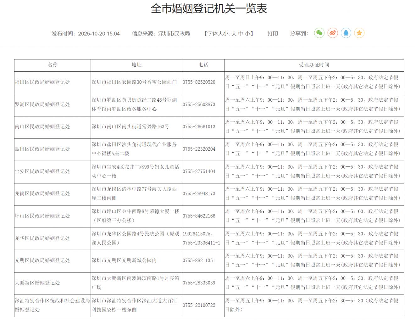 根据深圳婚姻登记处的工作安排,深圳10个区的婚姻登记处在政府法定节假日“五一”“十一”“元旦”假期当日照常上班一天(政府其它法定节假日除外)。