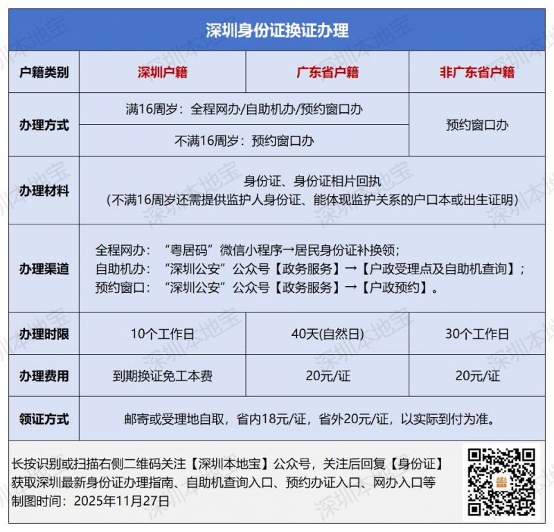 身份证损毁、信息变更或即将到期,期满前6个月就可以办理换证了。支持异地户籍在深圳换证。广东户籍的成年人自助机或者全程网办都很快,只需要提前准备好相片回执即可。