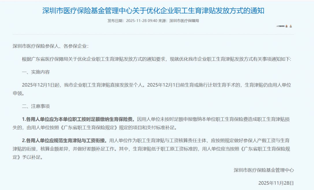 深圳市医疗保险基金管理中心2025年11月28日发布“关于优化企业职工生育津贴发放方式的通知”,根据通知内容,自2025年12月1日起,深圳市企业职工生育津贴直接发放至个人。2025年12月1日前生育或施行计划生育手术的,生育津贴仍由用人单位申领。
