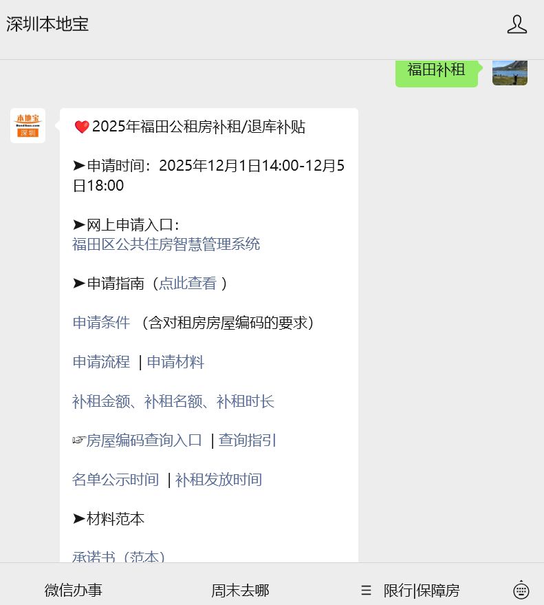 温馨提示:微信搜索公众号【深圳本地宝】,关注后在对话框回复【福田补租】可获福田公租房退库补贴有多少钱,哪些人可以申请、怎么申请、什么时候发放,以及承诺书范本下载入口、房屋编码查询入口、不动产信息查询入口等