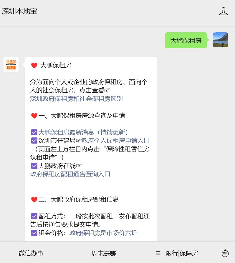 温馨提示:微信搜索公众号【深圳本地宝】,关注后在对话框回复【大鹏保租房】获取大鹏保租房配租房源项目、地址及户型、租金标准、申请企业+职工条件、申请材料、申请流程、申请附件下载等