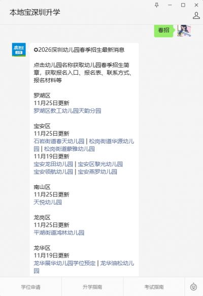 温馨提示:微信搜索公众号【本地宝深圳升学】,关注后在对话框回复【春招】可获取深圳幼儿园春季招生简章汇总、春季插班报名入口+材料、幼儿园名单等最新消息