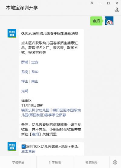 温馨提示:微信搜索【本地宝深圳升学】公众号,关注后在对话框回复【春招】获取深圳幼儿园春季招生简章汇总,获取报名时间、入口、材料、幼儿园联系方式等最新消息